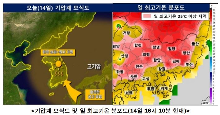 ○ (현황) 부산, 울산, 경남은 대체로 맑은 가운데 낮 동안 강한 일사와 더불어 남쪽으로부터 유입되는 따뜻한 공기까지 더해지면서 오늘(14일) 낮 기온이 경남내륙을 중심으로 25도 이상 오른 곳이 많았으며, 부산과 일부 경남 지역에 는 올해 들어 가장 높은 일최고기온을 기록한 곳이 있습니다.
