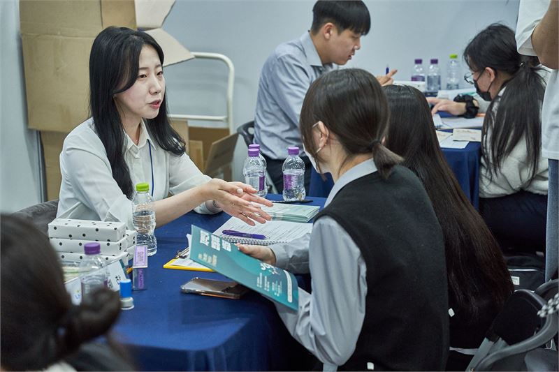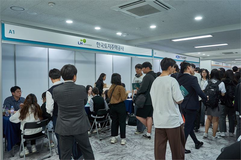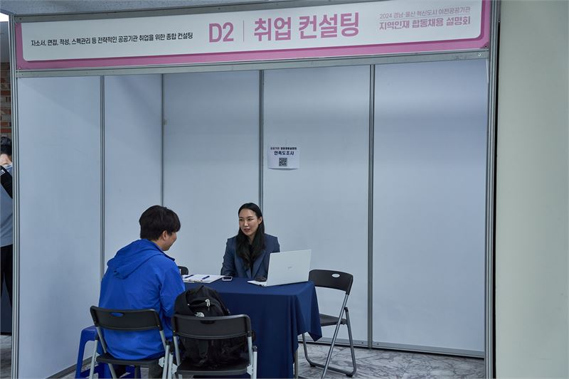 공공기관 채용 상담 부스에서 채용담당자가 취업 준비생에게 맞춤 상담을 하고 있다.