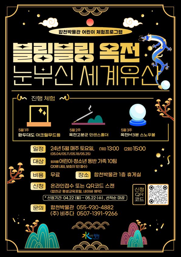 접수는 회차별로 어린이·청소년을 동반한 가족 20명을 대상으로 합천군 평생교육포털, 네이버 예약페이지(QR코드)을 통해 4월 22일부터 5월 22일까지 신청하면 된다.