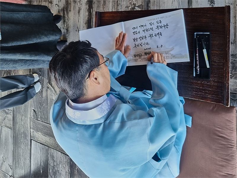 최만림 경남도 행정부지사가 밀양 영남루 국보 승격 축하글을 작성하고 있다. 이상 경남도