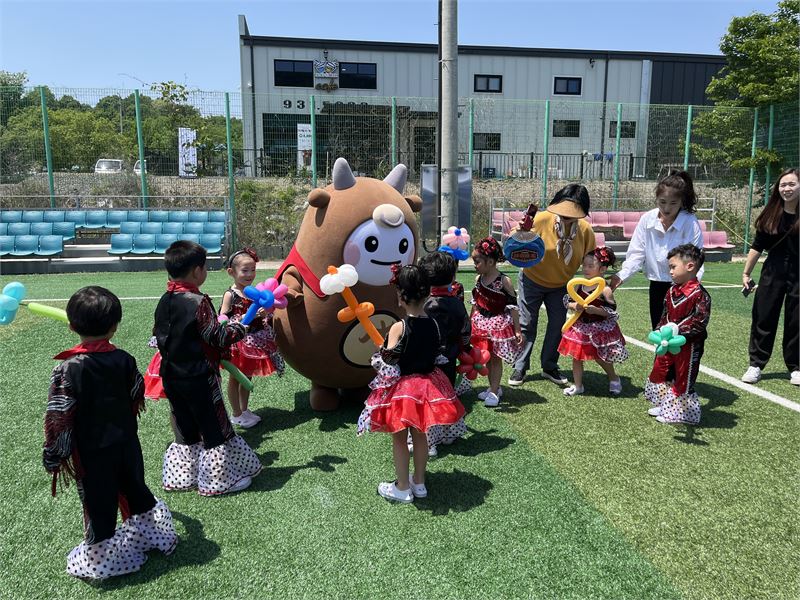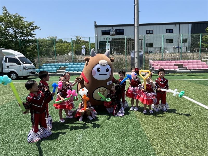 행사에 참가한 삼가 어린이집 아이들이 '소탈이'와 함께 기념사진을 찍고 있다.