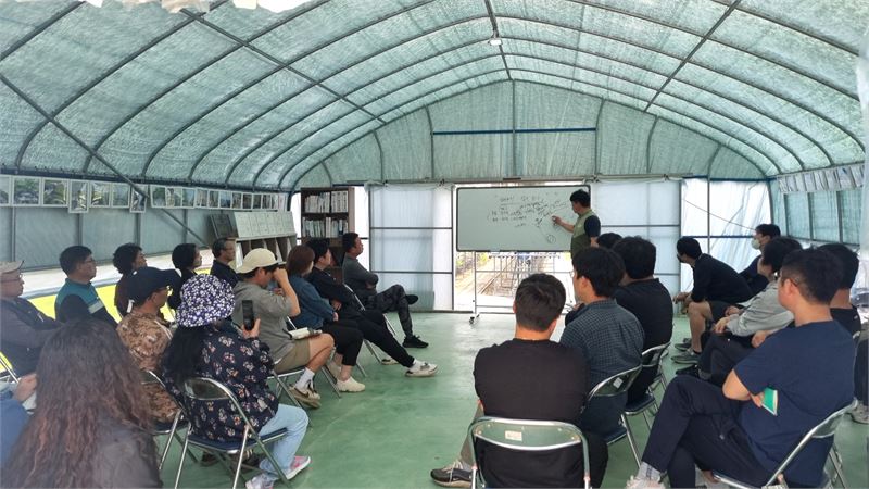 신규 딸기 농업인들이 하동군 옥종면의 선도 농가에서 딸기 재배기술 강의를 듣고 있다. 하동군