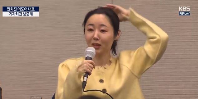 민희진 어도어 대표가 31일 한국프레스센터에서 기자회견을 하면서 오른손을 머리로 올리고 있다. KBS 중계방송 캡처