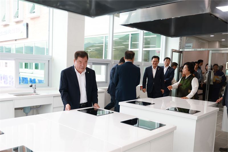 이승화 산청군수 등이 '산엔청 건강누리센터' 준공식에서 내부 시설을 둘러보고 있다.