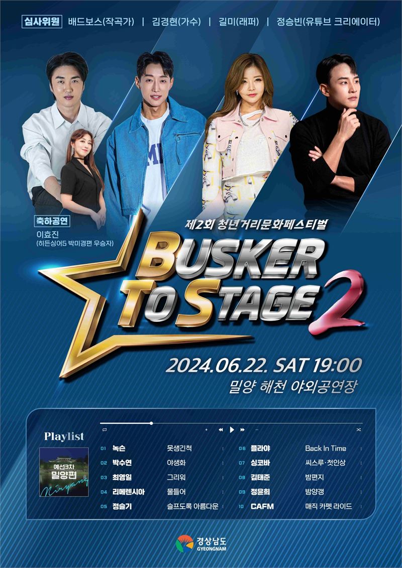 경남도는 오는 22일 밀양시 해천 야외공연장에서 제2회 청년 거리문화 페스티벌 예선 3차전을 한다고 밝혔다.