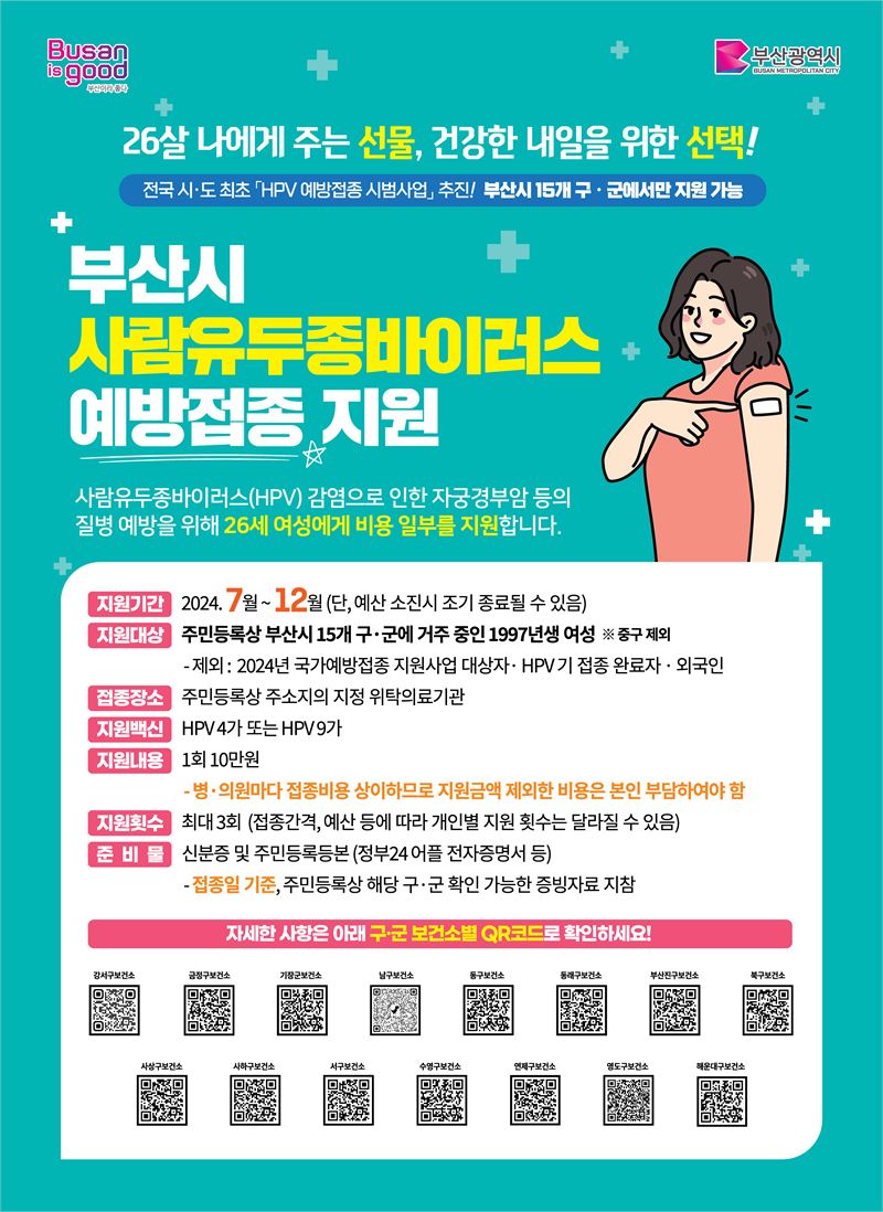 부산시는 전국 시·도 최초로 7월부터 26세 여성(1997년생) 대상 '사람유두종바이러스' 예방접종 비용 일부를 지원하는 시범사업을 한다고 1일 밝혔다.