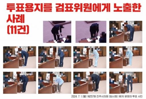 진주시의회 민주당 시의원들이 공개한 '투표용지를 감표위원에게 노출한 사례' 11건. 진주시의회 민주당 의원