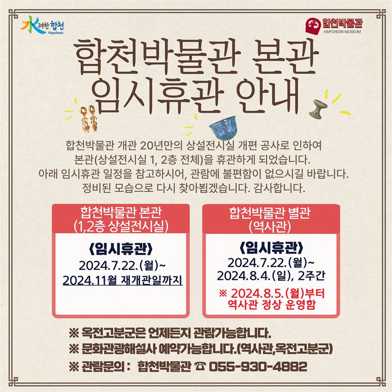 별관(역사관)은 22일부터 8월 4일까지 2주간만 임시휴관하고 8월 5일부터 정상 운영된다. 합천박물관 뒤에 있는 세계유산 '옥전고분군'은 박물관 휴관과 관계없이 정상 운영된다.