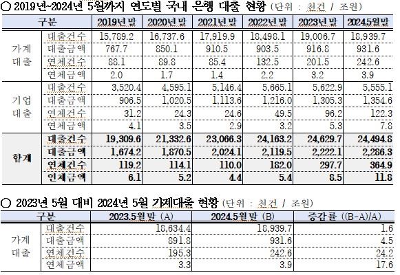부문별는 가계대출은 5월말 현재 931조 6000억 원(1893만 9700건)으로 전년 동월 891조 8000억 원보다 4.5% 증가했다.