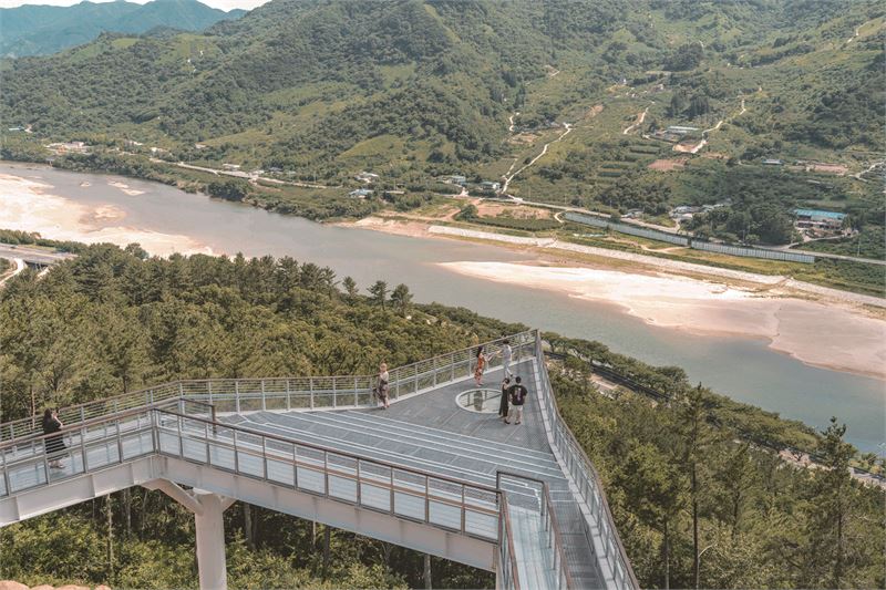 하동군 악양면에 세워진 별 모양의 스카이 워크 전망대. 유유히 흘러가는 섬진강과 악양 들판을 즐길 수 있다.