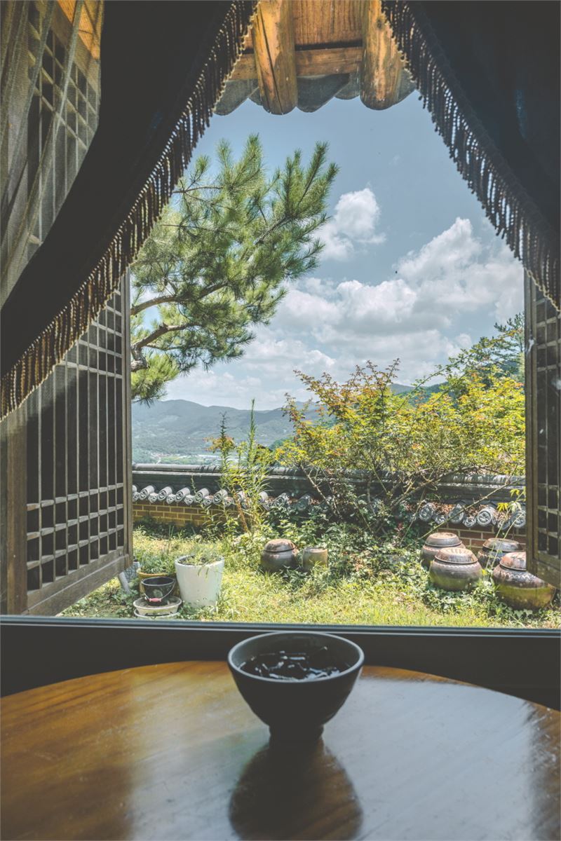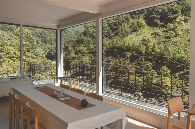 통창 안에 앉아 지리산 자락 계곡을 즐 길 수 있는 하동군 화개면의 '옥선명차'