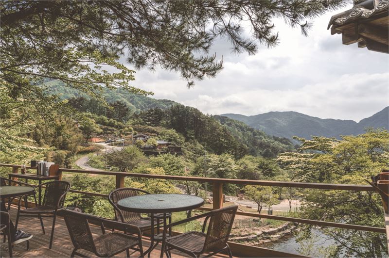 하동군 청암면 '청학동다소랑정원'. 전망대 카페와 그 아래에 계곡물이 보인다.