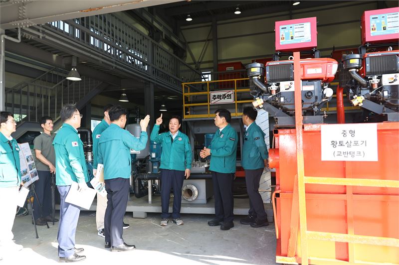 이어 통영시 인평항에 위치한 적조 방제장비 보관센터를 방문해 적조 대비를 위해 주로 사용하는 방제장비인 황토 살포기의 준비상태를 점검했다. 통영시 적조방제장비 보관센터에는 대용량 황토살포기 2대, 전해수 황토살포기 1대, 중형 황토살포기 5대 등을 보유·관리하고 있다.