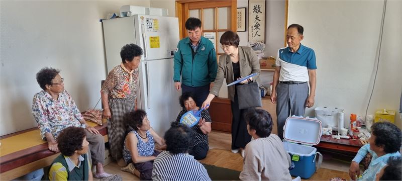 사천시 용현면행정복지센터에서 무더위 쉼터에서 쉬고 있는 어르신들에게 폭염 대비 행동요령을 안내하고 부채를 나누어 주고 있다.