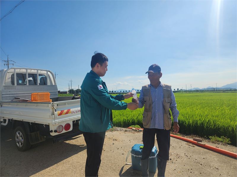 사천시 용현면행정복지센터에서 들에서 일하고 있는 어르신에게 시원한 물을 전달하고 있다. 이상 사천시