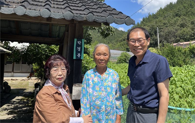 진주시 명석면 주민자치위원들이 박경분 어르신 댁에 단 문패를 배경으로 사진을 찍고 있다.
