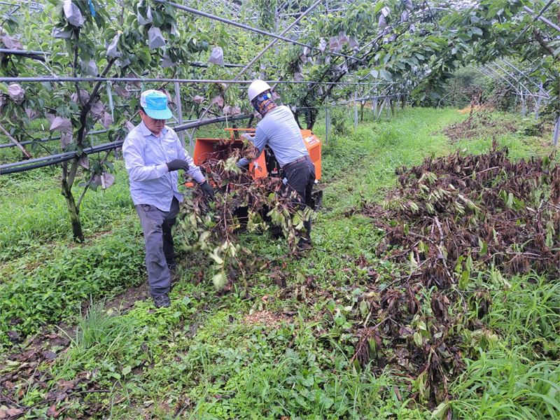 하동군 '영농부산물 파쇄지원단'이 과수 잔가지를 파쇄하고 있다.