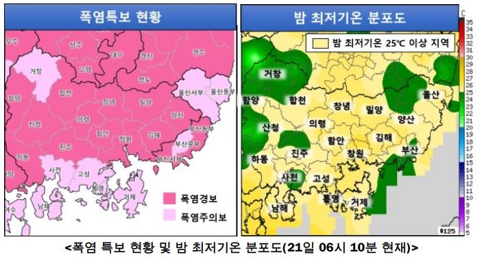 ○ 폭염경보: 부산(부산 서부, 부산 동부), 경남(양산, 창원, 김해, 밀양, 의령, 함안, 창녕, 진주, 하동, 합천, 산청, 함양)