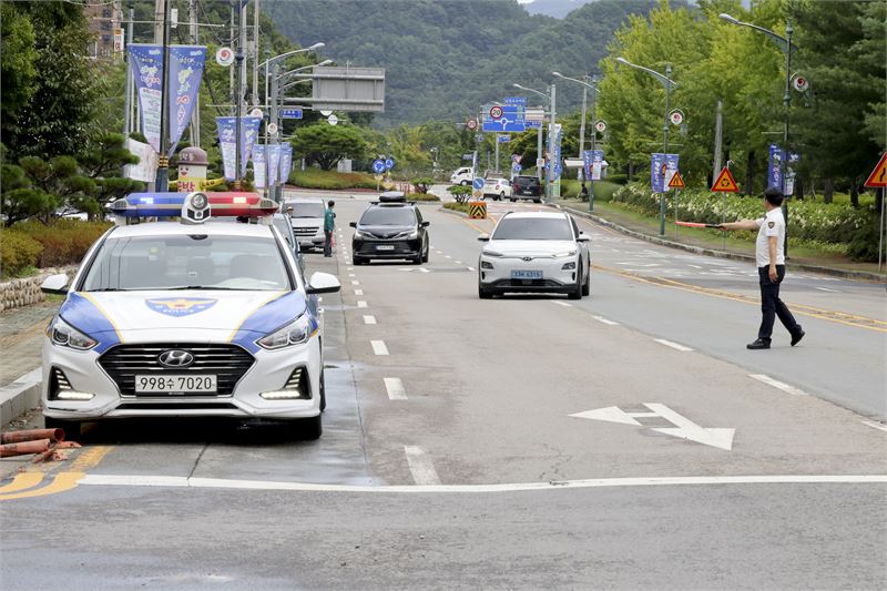 합천경찰서가 주관한 차량이동통제 훈련에서 차량 통제요원이 차량 운행을 안내하고 있다. 홈할인마트에서 군청 제2청사까지 진행됐다.