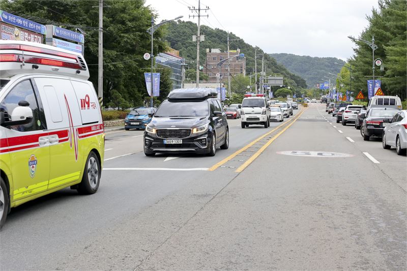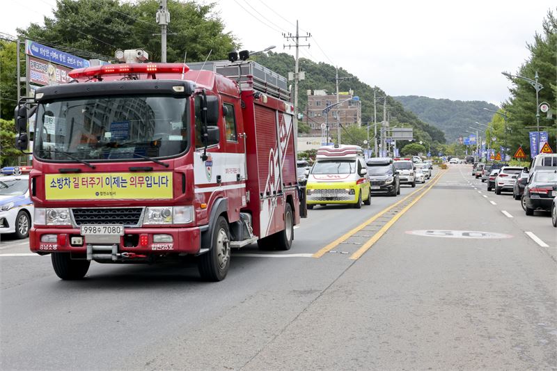합천소방서~합천공설운동장 구간 긴급차량 실제운행 훈련 모습. 이상 합천군