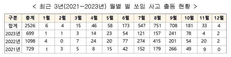도 소방본부 출동 통계(창원 포함)에 따르면 ‘벌 쏘임 사고’는 최근 3년간(2021년~2023년) 총 2537건이 발생했고, 이 중 8월~9월에 1459건으로 전체 출동의 57.5%를 차지했다.