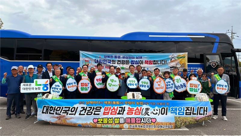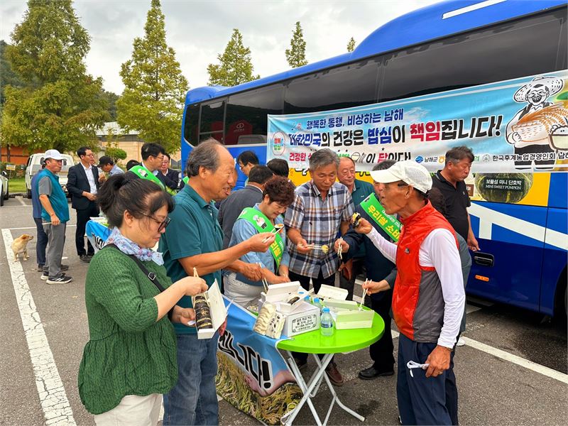남해군 후계농업경영인회와 농협중앙회 남해군지부, 지역농협 관계자들이 지난 3일 지역을 돌며 ‘우리쌀 애용하기 캠페인 행사’를 하고 있다.