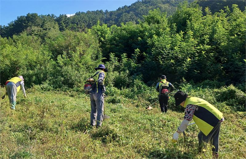 지수면 주민자치위원들이 청담마을 입구 일대에 자란 잡초를 제거하고 있다.
