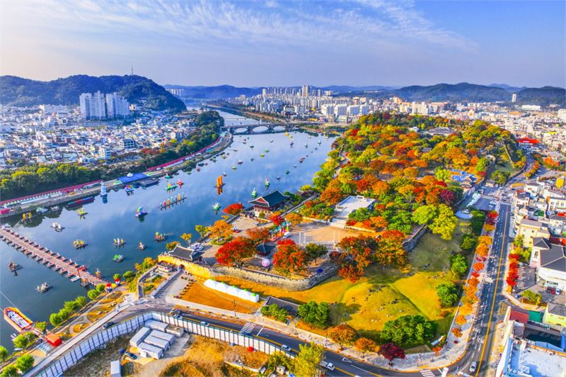 경남 진주시 도심에 위치한 진주성과 남강. 성 안에 알록달록한 가을색이 무척 아릅답다. 경남도