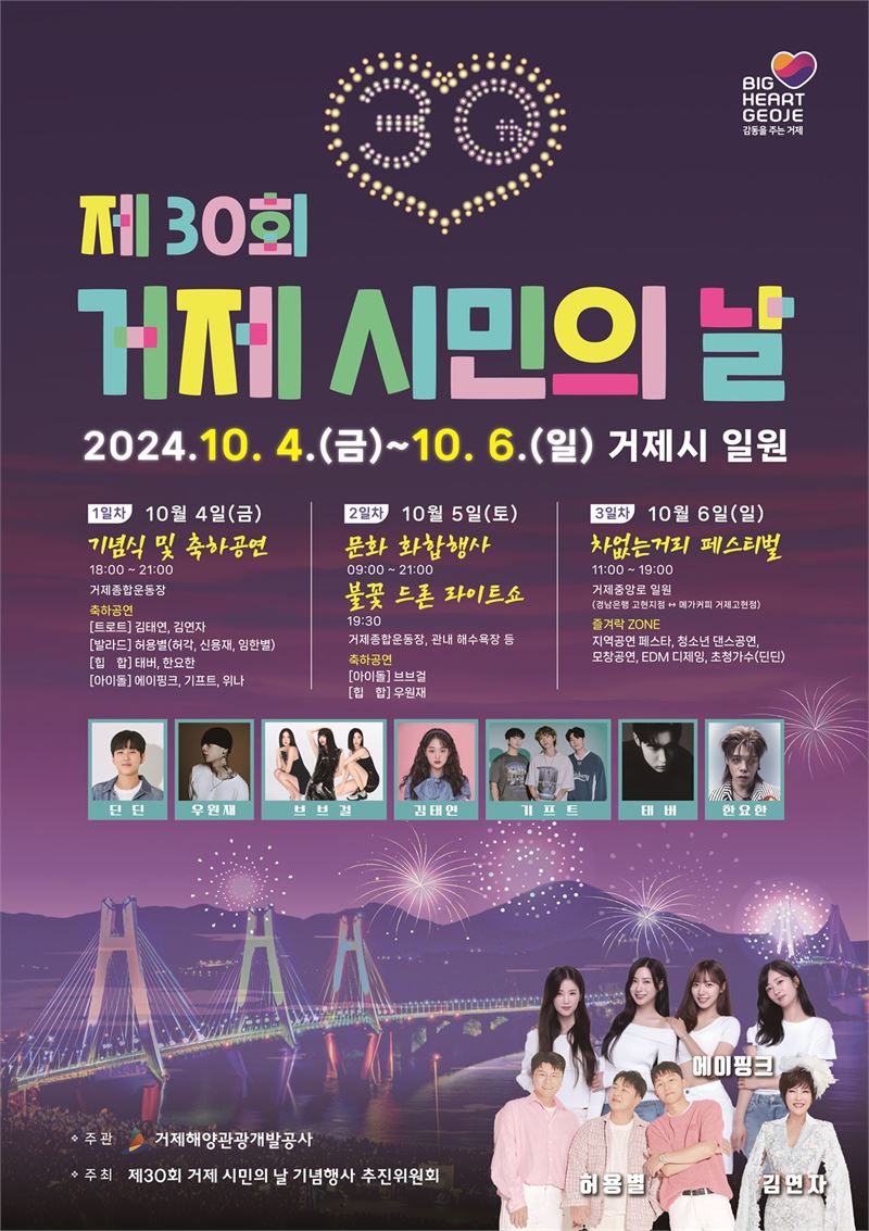 행사는 10월 4일 오후 6시 거제종합운동장에서 기념식과 축하 공연으로 막을 연다. 이날 에이핑크, 기프트, 위나, 김연자, 김태연, 허용별(허각·신용재·임한별), 태버, 한요한 등 다양한 장르의 가수들이 출연해 화려한 무대를 선보인다.