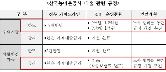 지난 2021년 8월 개정된 '공공기관의 혁신에 관한 지침'은 주택융자금과 생활안정자금의 대출 금리를 분기별로 연동되는 한국은행 가계자금대출금리를 하한으로 하고, 각각의 대출 한도를 1인당 각각 7천만 원과 2천만 원으로 제한하고 있다.