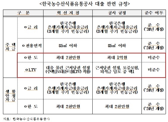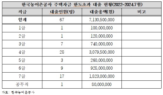 그러나 농어촌공사는 이를 무시하고 최근 3년간 67명에게 1인당 최대 1억 2천만 원까지, 총 71억 3천만 원의 주택융자금을 한도를 초과해 대출했다.