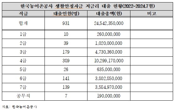 또 농어촌공사는 2022년 이후 931명의 신규 대출자에게 한국은행 가계대출금리(2024년 7월 기준 4.48%)보다 44% 낮은 2.50%의 저금리로 생활안정자금 245억 4200만 원을 제공했다.