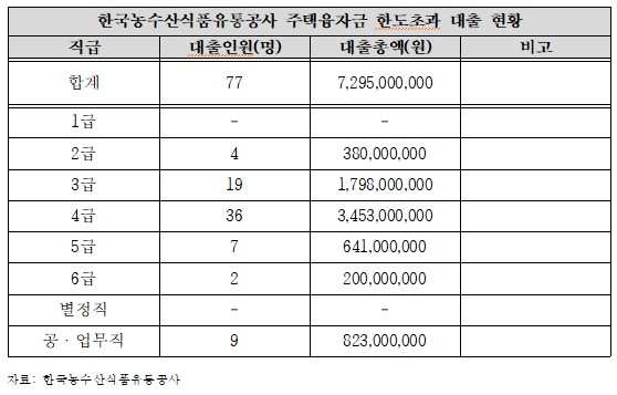 aT도 같은 기간 77명의 임직원에게 규정된 한도인 7천만 원을 초과해 1억 원까지, 총 72억 9500만 원의 주택융자금을 대출해 준 것으로 드러났다.