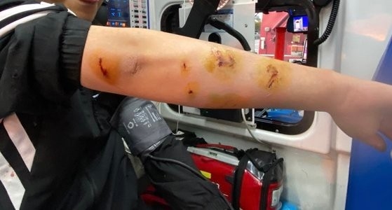 30대 남성이 멧돼지에 오른팔을 물린 자국들. 경남소방본부