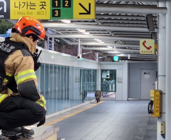 출동한 소방 대원이 경남 양산시 부산도시철도 2호선 호포역에 뛰어든 멧돼지의 동태를 주시하고 있다. 경남소방본부