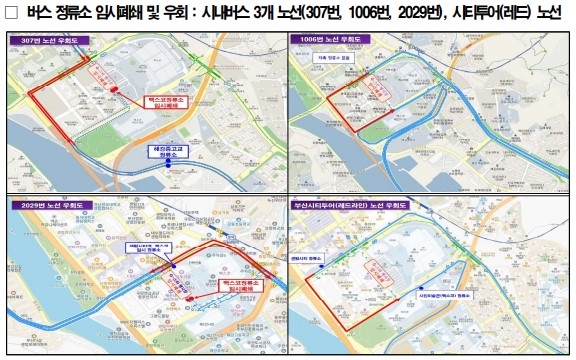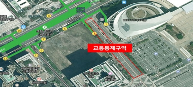 도로 통제에 따라 시내버스 3개 노선(307번, 1006번, 2029번)과 시티투어(레드)노선이 벡스코 정류장에 정차하지 않고 우회 운행한다.