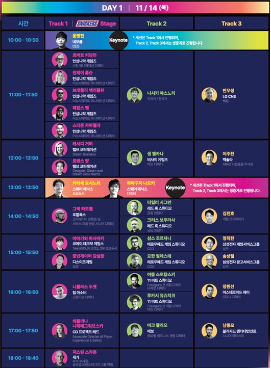 세계 유수의 콘퍼런스와 견줄 수 있는 최고 수준의 라인업(출연진)과 게임 산업을 관통하는 다양한 주제로 청중을 맞이할 예정이다.
