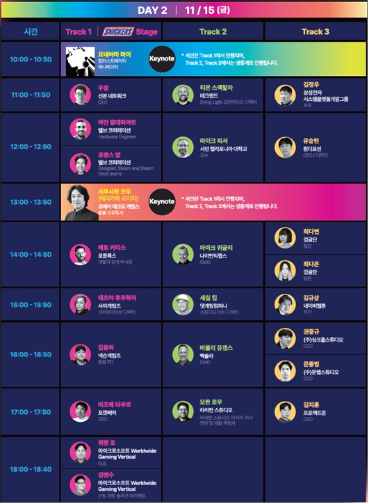 시부사와 코우 코에이 테크모게임즈 총괄 프로듀서와 니콜라스 두셋 팀 아소비 스튜디오 디렉터 등 세계 유수의 게임 개발진을 만날 수 있다. 또 윤명진 네오플 대표, 김용하 넥슨게임즈 총괄 피디(PD) 등 국내 게임업계 명사들도 연사 명단에 포함됐다.