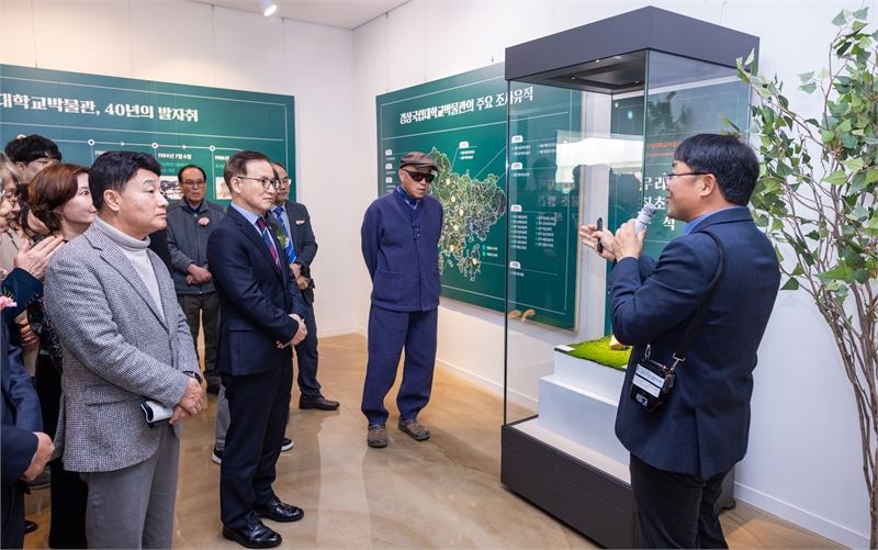18일 오후 진주시 가좌캠퍼스 경상국립대박물관 1층 로비에서 열린 개관 40주년 특별전에서 권진회 총장 등 관계자들이 박물관 관계자의 설명을 듣고 있다. 경상국립대