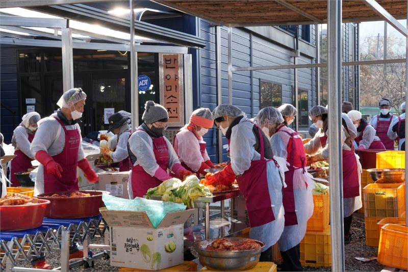 속덕사 김장김치 나눔 행사에 참여한 자원봉사자들이 절인 배추에다 버무린 양념을 입히고 있다.