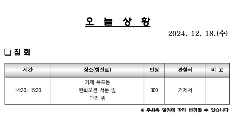 정책·정치·사회존 > 사회(사건사고&교통&노동환경) 경남경찰청이 제공하는 [오늘의 집회]···18일 오후 거제 옥포동 한화오션 서문 앞 더경남뉴스 승인 2024.12.18 12:19 0 더경남뉴스는 경남경찰청이 제공하는 경남 도내에서 예정된 집회 내용을 주기적으로 전합니다. 각종 집회가 전하는 메시지도 있지만, 교통 정체 등 주민 생활에 직접 관계가 있기 때문입니다. 8 0 더경남뉴스 더경남뉴스 thegnnews@naver.com 더경남뉴스의 기사 더보기 저작권자 ⓒ 더경남뉴스