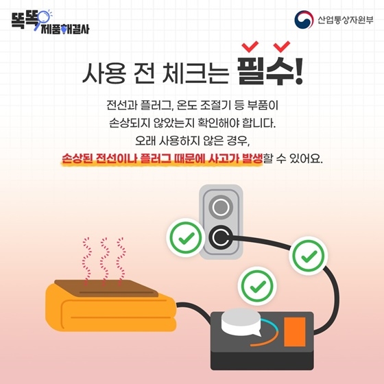 전기장판 등 전열기구를 안전하게 사용하기 위해서는 ▲지나치게 높은 온도에서 오래 사용하지 말고 ▲외출 시 반드시 전원 OFF ▲취침 시에는 타이머를 설정하거나 낮은 온도로 설정하는 것이 좋다.