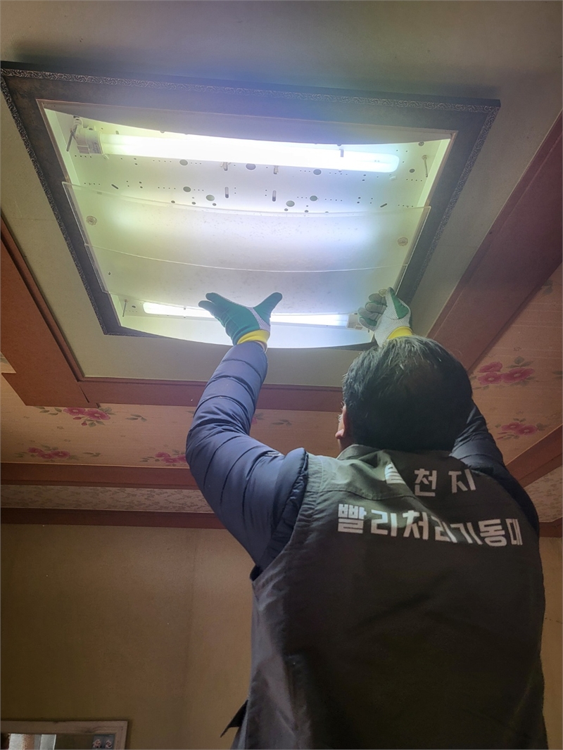 별천지빨리처리기동대 남자 대원이 한 가정의 천장 조명등을 교체하고 있다.