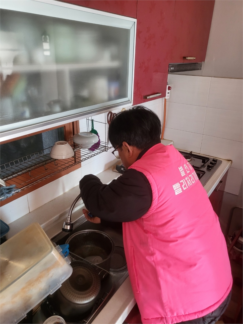 별천지빨리처리기동대 여자 대원이 개수구의 수도꼭지를 점검하고 있다.