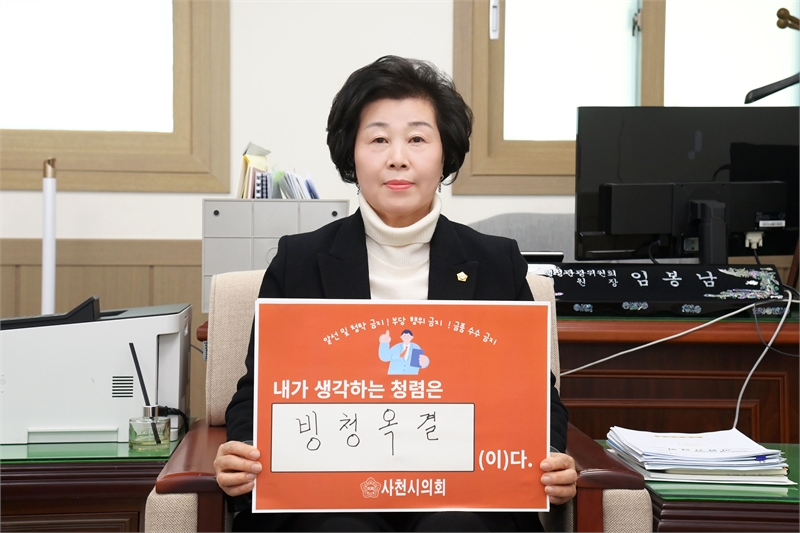 사천시의회는 청렴 캠페인 전개, 청렴 교육 실시, 행동강령 준수 여부 점검 등을 하며 부패 방지 및 청렴 실천에 노력하고 있다.