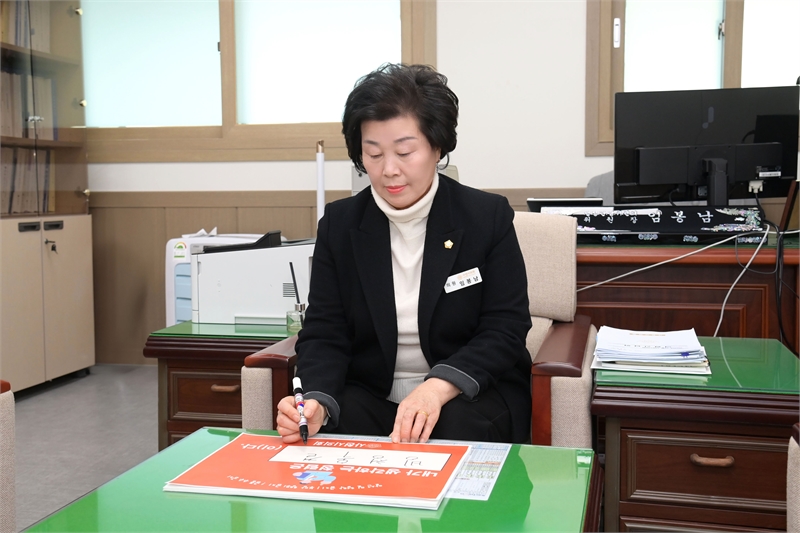 사천시의회 '이달의 청렴의원' 1월 캠페인에 참여한 임봉남 의원이 청렴 의지를 담은 '빙청옥결(氷淸玉潔)’ 사자성어를 쓰고 있다. 사천시의회