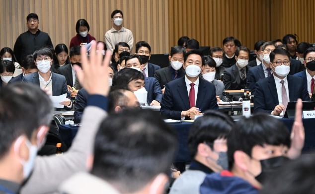 오세훈 서울시장이 지난 14일 서울시청 대회의실에서 열린 '규제 풀어 민생 살리기 대토론회'에서 시민들의 의견을 듣고 있다. 서울시