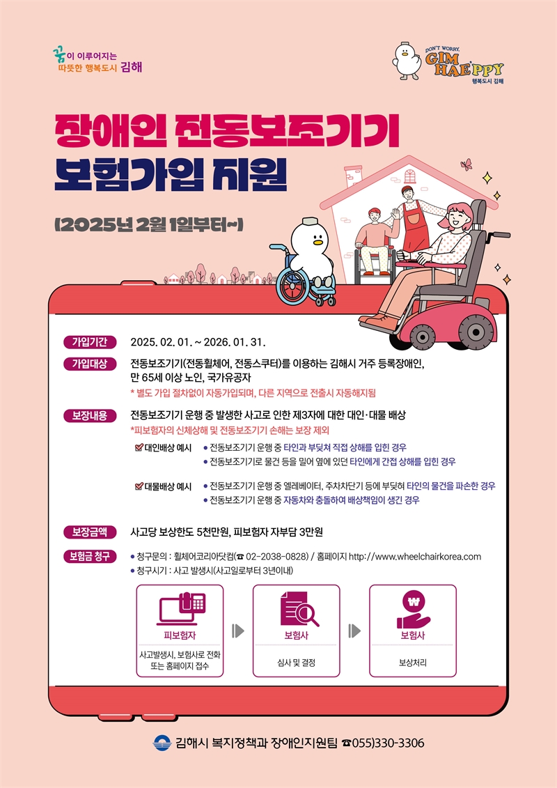 보험 기간은 2월 1일부터 2026년 1월 31일까지 1년이다. 지원 대상은 주민등록상 김해시에 거주하며 전동보조기기를 운행하는 등록 장애인 또는 65세 이상 노인으로 별도 가입 신청을 하지 않아도 혜택을 받을 수 있으며 타 지역으로 전출 시 자동 해지된다.