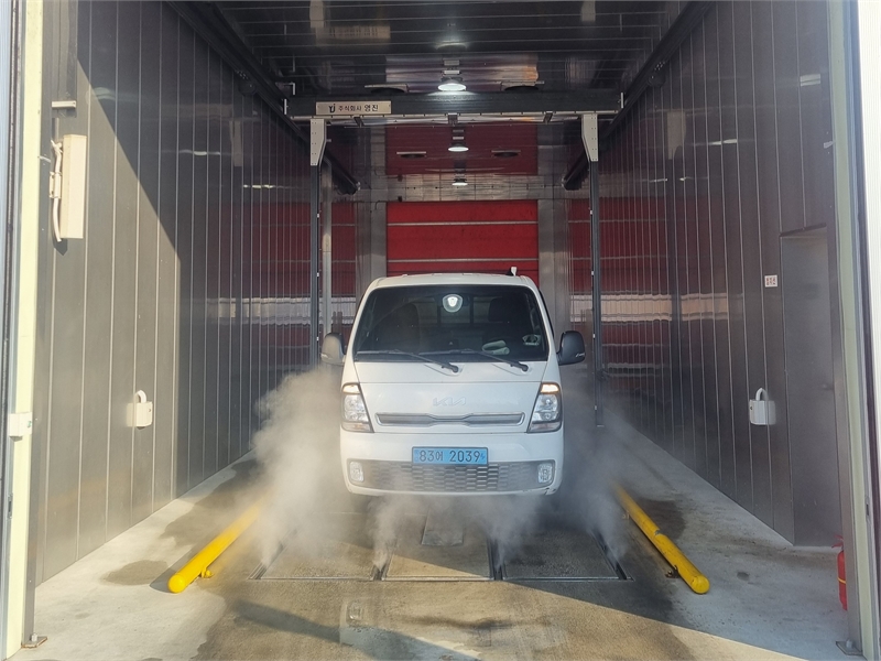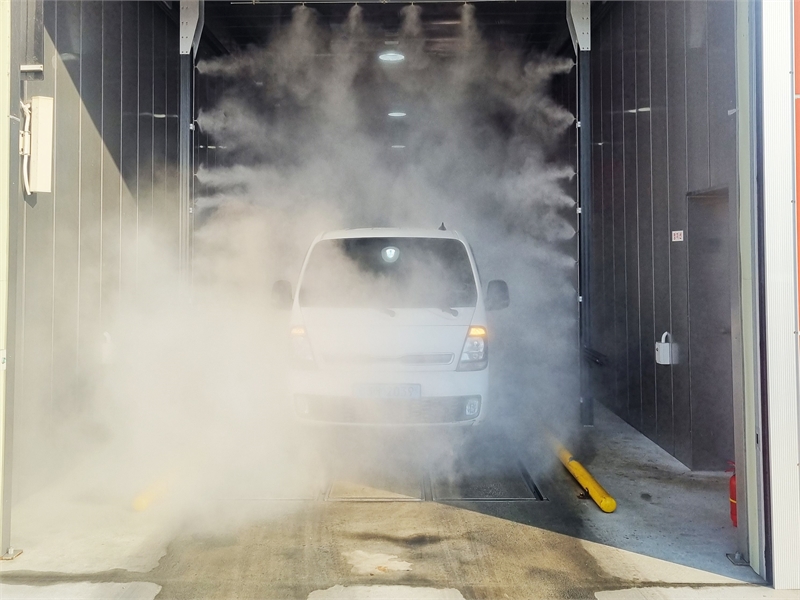 차량이 소독을 하는 공간에 들어가 정차한 상태에서, 소독약이 구멍 뚫린 아래 공간을 통해 위로 뿜어져 나오고 있다.