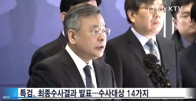 박영수 '박근혜 대통령 국정농단' 전 특검이 지난 2017년 3월 6일 최종수사 결과를 발표하고 있다. KTV 뉴스 캡처